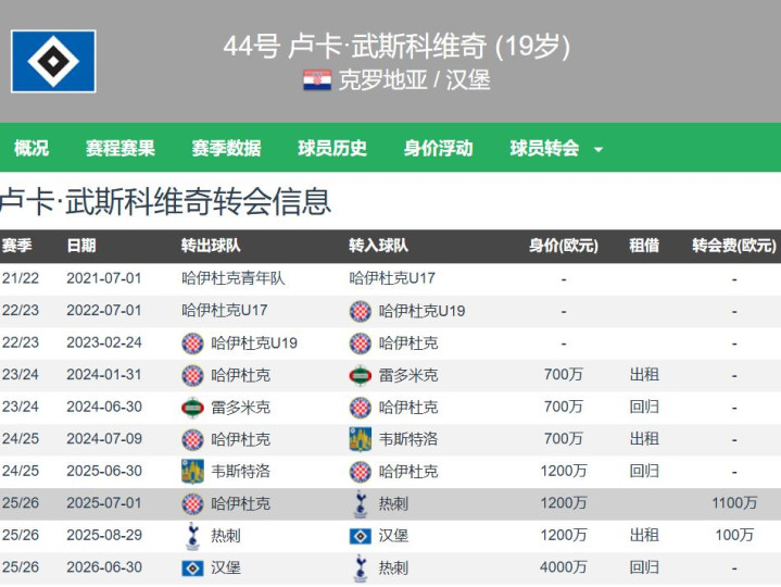 武什科维奇上月刚度过19岁生日,身高1.93米,右脚中央防守,与热刺的队员劳务协议至2030年,德转估价4000万欧元,已经是汉堡队内第一身价,这次德转更新,武什科维奇的身价铁定会升至5000+万欧元。武什科维奇是一位少年老成的带刀守卫者,本比联赛季德甲23次出场,全部首发球员阵容,身为中央防守已经打入了5球。热刺目前在为英超保级而战,不过队内中央防守储备是真丰富。