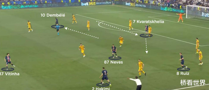 向内推进时,克瓦拉茨赫利亚的触球细碎且密集,能快速应对防卫 球员的上抢与对峙 。在一对一锁定防卫 者后,他会沉肩虚晃,先将球轻拨向右侧,随即下一脚触球把球扣回中路,以此摆脱防卫 。